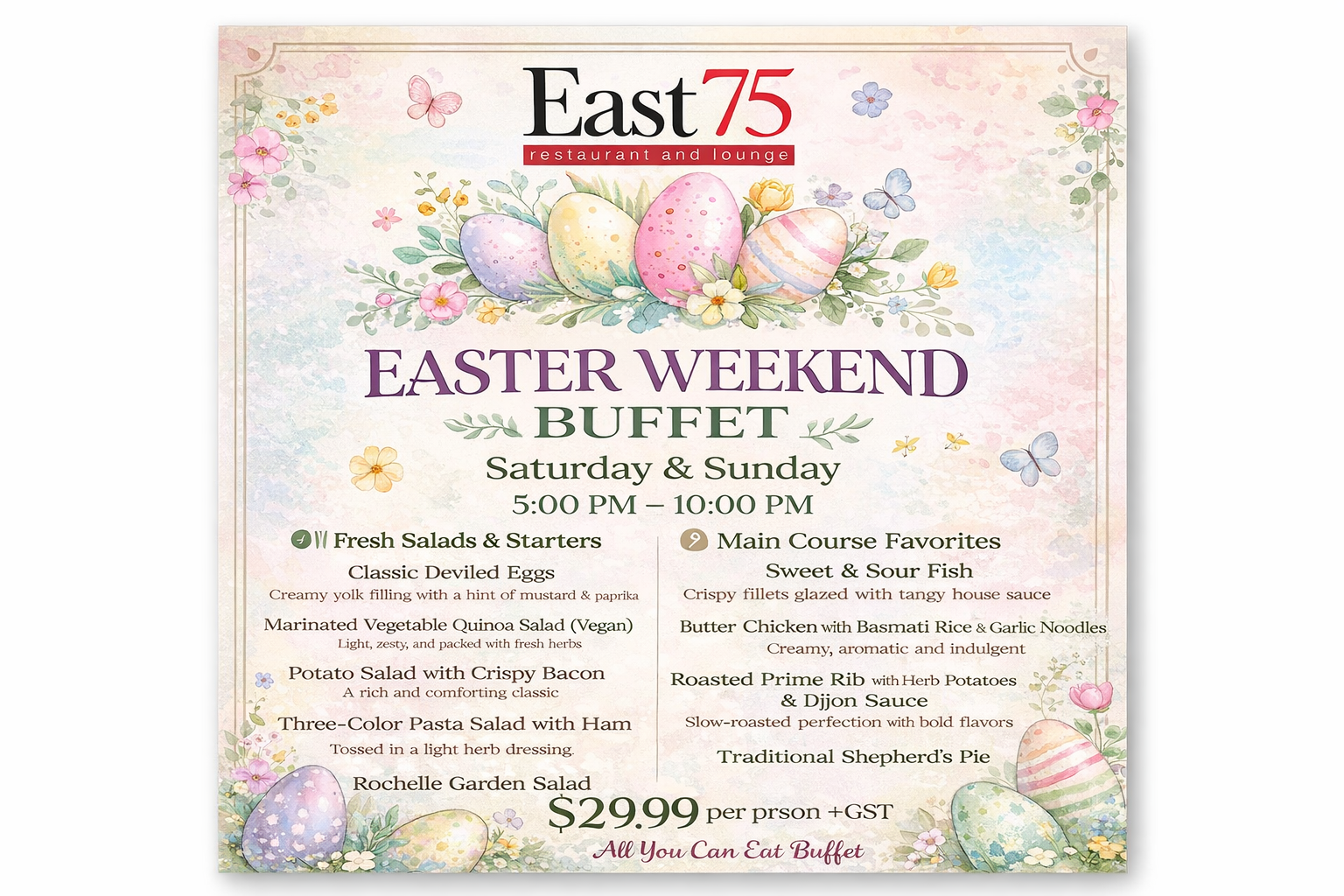 Welcome to East 75, where culinary innovation meets a warm and inviting atmosphere. Our menu is crafted with a passion for quality and creativity, offering a diverse selection of dishes that cater to every palate.